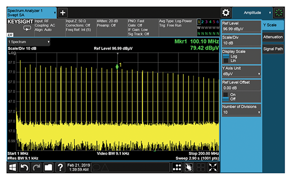 Note that the measurement in dBµV is approximately 107 dB higher than the measurement in dBm, as predicted by Equation 8.