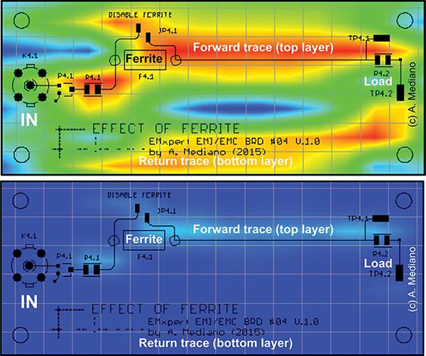 Note in upper part of the figure how the forward and return paths of the signal are clearly seen when the ferrite is not present and a big loop is present. In the lower part of figure the activity in the board is clearly reduced when the ferrite is present. The ferrite is effective and the current return paths are clearly identified.