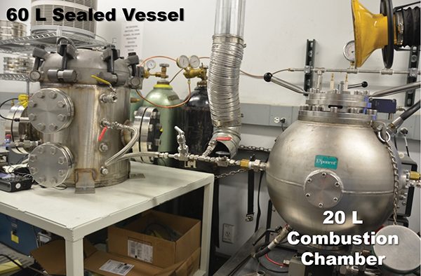 Vent gas composition, flammability characteristics, and potential combustion energy released in the event of ignition can be evaluated by forcing a cell failure in a sealed vessel testing apparatus. The sealed vessel is designed to contain the battery vent gases and to quantify the vent gas volume by tracking the temperature and pressure increase in the vessel. The sealed vessel testing apparatus includes a sampling port through which the vented gases can be collected in a sample canister and analyzed for composition using techniques such as gas chromatography (GC) and gas chromatography-mass spectrometry (GC-MS). Note that depending on the cell capacity, different sealed vessel sizes need to be used depending on the expected vented gas volume. Figure 1 shows a photograph of a 60-liter sealed vessel connected to a 20-liter combustion chamber used for battery vent gas explosion testing.