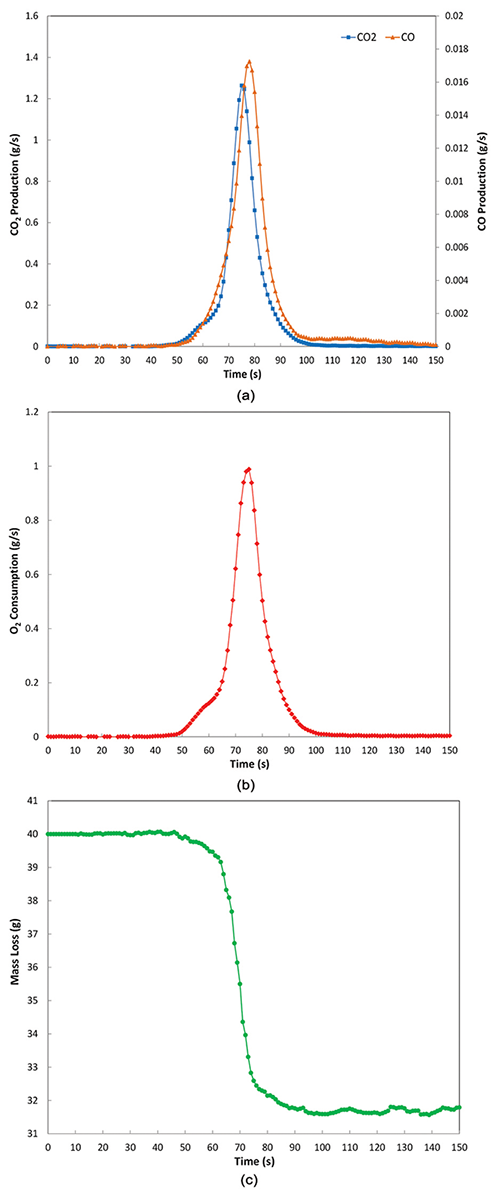 After the 1st phase, a transition to faster reaction kinetics is observed at approximately 65 seconds. Increases in the CO2 and CO production rates combined with a rise in oxygen consumption areshown on Figure 2a., 2b., and 2c. This large increase is confirmed by changes in the slope of the production, consumption, and mass loss rate curves. At this stage, the bulk material within the cell is involved in the combustion process. This 2nd phase lasts for approximately 35 seconds before extinction occurs. The peaks of CO2 and CO are respectively 1.3 and 0.02 g/s. The total mass loss at the end of the test is about 8.4 g. This mass loss compares to the total mass of organic compounds present in the Li-ion cell and is evaluated to be approximately 9.0 g.