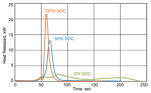 Although the cone calorimeter can be used to determine several parameters (e.g., critical heat flux for ignition, ignition time, etc.), one of the most important parameters measured is the heat release rate (HRR). The HRR is the amount of energy produced by the combustion process per unit of time (expressed typically in kW). It is the single most important parameter for determining the fire hazards associated with a given material or product and for designing fire protection systems. Figure 3 shows the evolution of the heat release rate as a function of time for a 7.7 Wh Li-ion cell at 0%, 50%, and 100% SOC. At the peak of the combustion event, the fire releases approximately 22 kW, 13 kW, and 2 kW of power for cell SOCs equal to 100%, 50%, and 0%, respectively. Once again, the heat release rate is very dependent on the state of charge of the cell.