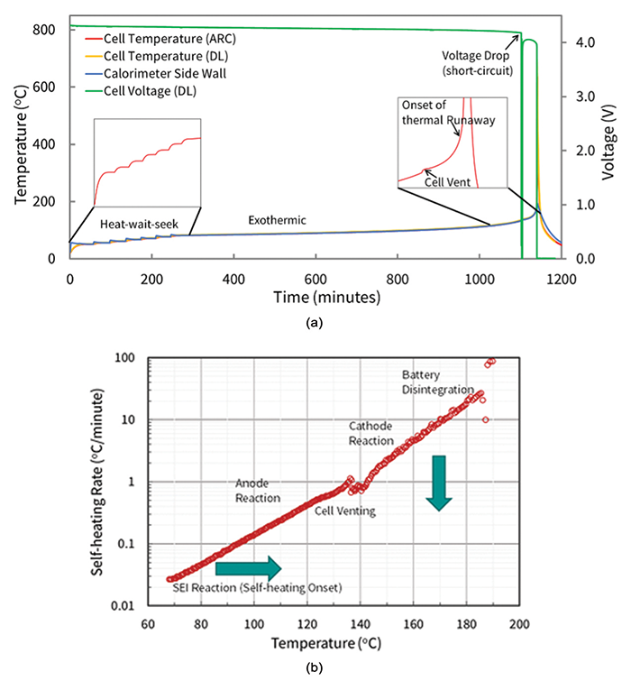Once the system detects self-heating of the sample during a search step, the system increases its temperature to match the sample temperature, thus creating an adiabatic environment. This temperature tracking continues until the cell thermally fails or a designated temperature set point is reached. Evaluating the self-heating as a function of temperature, cell voltage, and sometimes the evolved gas/pressure for ARC tests in a sealed vessel allows for analysis of various chemical reactions and events that occur during thermal failure of a cell. These include solid electrolyte interface (SEI) decomposition, electrolyte venting from cell enclosures, separator failure and/or shut-down, positive electrode oxidation, and more (see Figure 4).