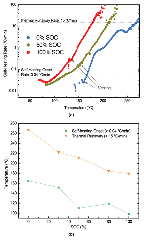 ARC can be used to study the variety of variables that affect the thermal decomposition and runaway characteristics, including cell size/shape/capacity, cell format, SOC (see Figure 5), chemistry and morphology of the electrodes, electrolyte composition, state-of-health (or life), presence of plated lithium metal, etc. If ARC testing is performed with the battery sample in a sealed vessel (e.g., inside of the larger ARC chamber), the overall energy release from the thermal runaway event can be estimated using the heat capacity of the sample in conjunction with the temperature rise experienced on the sample, the temperature rise of the ARC vessel, and the known heat input into the system via recorded heater power.