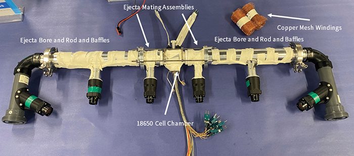 The cell chamber is connected to the ejecta mating assemblies via ceramic bushings that provide a certain degree of thermal isolation between the sub-assemblies while guaranteeing the continuity of the flow path for the vent gases ejected during the battery failure event. The ejecta mating assemblies are designed to capture large debris and ejecta released during cell failure. The ejecta bore assemblies and rod-and-baffles assemblies are located downstream of the ejecta mating and are designed to extract sensible energy from the vent gases by creating a tortuous flow path encompassing (1) a series of aluminum baffles and (2) copper mesh windings. Figure 6 shows a photograph of an FTRC equipped with a 18650 cell chamber. Note the two copper mesh windings prior to installation in the FTRC.