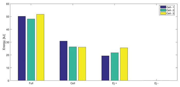 Examples of energy yield estimations associated with battery thermal runaway events is presented in Figures 7, 8, and 9. We performed triplicate FTRC tests on 18650 cells with a capacity of 2.6 Ah and a state-of-charge of 100%. Figure 7 shows a bar plot depicting the total energy yield that evolved during a thermal runaway event of the three subject cells. The testing results show a total energy yield ranging between approximately 48 kJ and 52 kJ. The yield fractions associated with the cell body range between 26kJ and 31kJ and those associated with the positive vent gas and eject range between 19 kJ and 26 kJ. Figure 8 shows the time-dependent evolution of energy yielded by the cell failure as measured by the calorimeter apparatus. Figure 9 shows the fractional mass distribution measured during the tests.