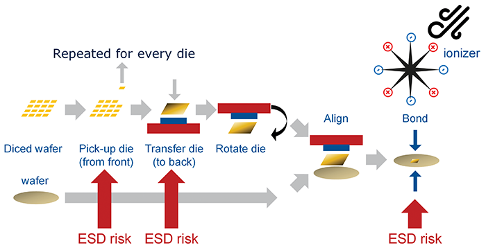 Electro-Static Discharges (ESD) can occur during die or wafer stacking. Die pick-up, die transfer and die or wafer bonding (Figure 1) are process steps with an increased risk for ESD. Like for conventional IC packaging ESD control and ESD protection design are available to prevent ESD related damages. ESD control techniques minimize the charging and discharging during the stacking and bonding process. Protection design increases the ESD robustness of die-to-die interfaces.