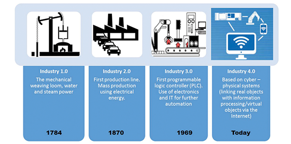 With the advent of IoT, society evolved from the 3rd industrial revolution, which is machine automation, to the 4th industrial revolution, where Cyber Physical Systems (CPS) dominate the manufacturing floor, linking real objects with information processing, and virtual objects via the internet. The goal is to converge Operational Technology (OT) and Information Technology (IT). In 2011, the German government launched a project under the name “Industrie 4.0”, providing a vision for advanced manufacturing with technological evolution from human controlled automation to machine controlled automation. Since then, the term “Industry 4.0” has been widely adopted to describe the 4th industrial revolution (Figure 3).