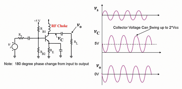 The other important characteristic of clamp design is to make sure the clamp is off during normal operation. In typical analog and digital circuits, the signal never exceeds the supply rails. The opposite is true of an RF circuit. Figure 2 illustrates a simple RF circuit. Here the power amplifier transistor’s collector there is an inductor, not a bias resistor. This implementation serves two purposes. Resistors dissipate power, therefore reducing efficiency, and inductors block RF signals. The inductor looks like a very high impedance at the RF frequency; hence, this is called an RF choke since no RF will get to the power supply with the choke in place. In this scenario, the instantaneous voltage at the collector can exceed the power supply since the power supply is isolated from the RF signal [3].