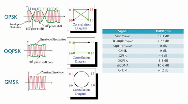 Digitally modulated RF signals also have envelope fluctuation that is characterized by a quantity called peak-to-average power ratio (PAPR). Figure 3 illustrates that quadrature phase shift keying (QPSK) has the most envelop fluctuation in this example, whereas gaussian minimum shift keying (GMSK) has none.