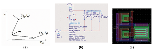 Figure 7a shows a snapback characteristic. It has a high turn-on voltage (Vt). After turn-on, the voltage snaps back to a lower, holding voltage (Vh). This voltage is sustained with low Ron until the clamp itself fails. If a process supports BJTs (say a heterojunction bipolar transistor (HBT) process), then snapback clamps are simple, small and effective and offer lower parasitics than diode stacks. Figure 7b shows a typical base-open clamp for the positive protection. The reverse diodes are for the negative protection.