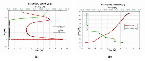 Figure 8 shows the transmission line pulsing (TLP) [9] results for the base open clamp. Figure 8a shows the clamp turns on at 19V. Once on, the clamp snaps back to 6V and protects the amplifier. The clamp fails at about 1.4A which has an equivalent protection of higher than 2kV HBM. Figure 8b is the response of the diodes in the reverse direction. Since the RF trajectory on the collector node will never swing negative, one diode in the reverse direction is sufficient. Note that once proper protection level is achieved, it is imperative that the clamp S-parameters are measured, and a total off-state capacitance is extracted. This capacitance may be more than the models predict due to additional parasitics of the layout which is important information for the designer.