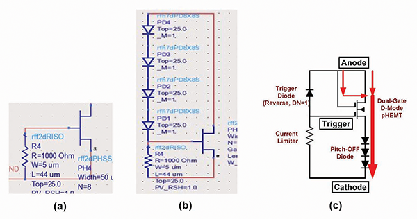 An HBT process isn’t the only RF process used for mobile applications. Another type of process called pseudomorphic high electron mobility transistor (PHEMT) can be used as well. For enhancement-mode (E-mode) processes, the snapback clamp is very similar. Figure 9a and 9b shows the equivalent E-mode snapback clamp. Similarly, some PHEMT processes are depletion-mode (D-mode) only. Figure 9c shows the equivalent snapback clamp for D-mode processes [10]. Note that in 9c that the pinch off diodes are there to keep the clamp off during normal operation. If the gate of the D-mode FET is floating, the FET will be on and current can flow. However, the diodes require a voltage at the drain high enough to turn them on. The higher the RF power and PAPR, the more diodes are needed, and this will make the clamp larger. It is not as elegant of a solution as in the E-mode or HBT processes.