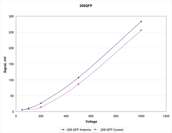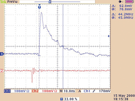 Figure 2 shows the correlation between direct current measurements in a specially-designed test fixture and the electromagnetic signal generated by the discharge and captured by an antenna located nearby. As seen, both traces track reasonably well providing confidence in relevance and in accuracy of the obtained data.