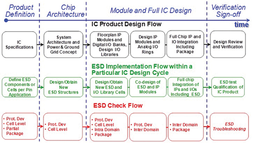Figure 1 illustrates the timeline and main stages for an example design flow. The IC product design flow (top row) needs to be synchronized with an ESD development and implementation flow (middle row). The latter needs to be supported by an ESD check flow (bottom row).