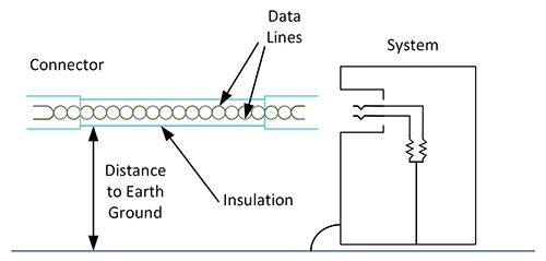 Other than coaxial cable, an unshielded twisted pair is the simplest data cable type. Most Ethernet cables are a bundle of 4 unshielded twisted pairs. The classic way for a cable to become charged is by dragging it on the floor and charge builds up on the insulator. Over time the charge may migrate to the conductors, but even if it doesn’t the cable is now at an elevated potential. Plugging the cable into a system, as shown in Figure 1, will create a CDE [1]. How much current occurs during the event depends more on the environment than it depends on the cable properties itself. The two wires in the twisted pair will likely be at essentially the same elevated potential with respect to their surroundings. The cable discharge event will be governed by the transmission line properties of the twisted pair with respect to ground potential, for example, the floor.