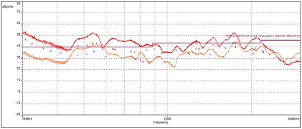 Figure 11 shows the radiated emissions results for the two‑layer board with slots in the ground reference return.