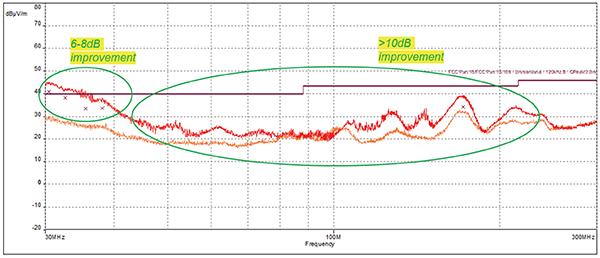 Figure 11 shows that the introduction of a ground reference return, even with slots in it, provides us with a 6-8dB improvement from 30-45MHz, and an improvement of greater than 10dB from 45MHz-240MHz.