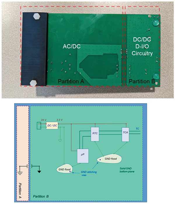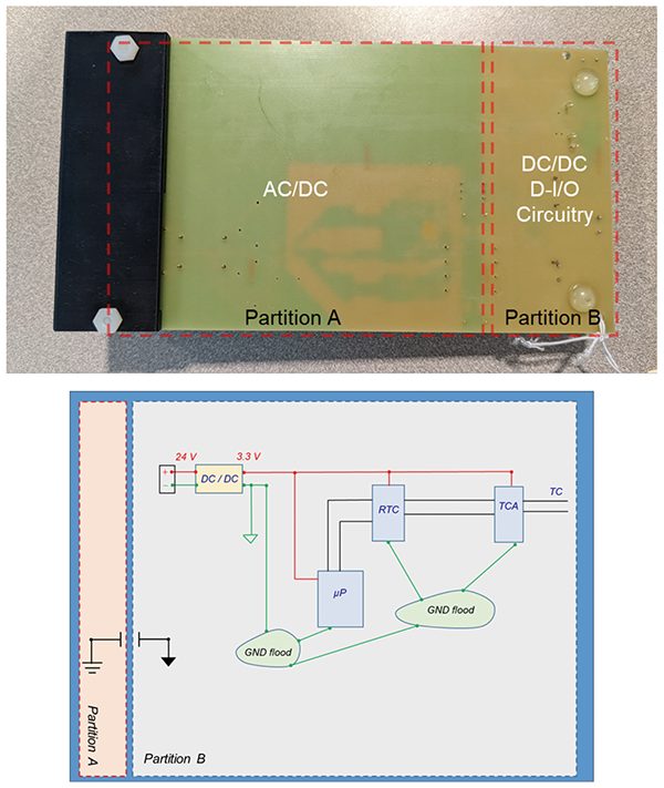 The board is capable of accepting either an AC or DC input. The AC to DC conversion takes part in Partition A of the board (not drawn to scale). The DC to DC converter in Partition B accepts 24V DC input either from the AC/DC converter in Partition A or from an external source [1]. The AC to DC converter is controlled by a Maxim MAX5022 IC, the DC to DC converter is controlled by MAX17783CATB+. These two circuits provide power to the embedded system section of the board, which consists of a ST Microelectronics STM32G030F6P6 microcontroller, a Microchip MCP7940NT-I/MS real time clock, and a Maxim Integrated MAX31855JASA+ cold-junction compensated thermocouple to digital converter.