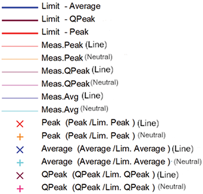 Conducted emissions were measured in the frequency range of 150 kHz – 30 MHz. Figure 5 shows a reference legend for these measurements.