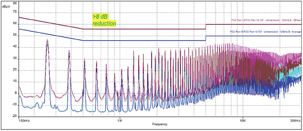 Figure 7 shows at least 8dB of improvement across most of the 150kHz-30MHz frequency range. We can conclude that introducing a ground reference return (even with slots in it) on the bottom layer significantly improves the conducted emissions performance and results in passing the test.