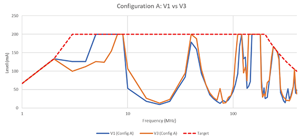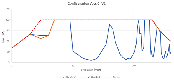 Finally, the worst-performing variant from Configuration B (Variant 1) was re-tested in the same frequency range according to Configuration C (conductive standoffs, conductive gasket, selective filtering components on analog lines). Figure 11 compares the test results for Variant 1, Configuration A vs. C.