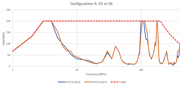Observations: Variant 6 in Configuration A performed better than Configuration B with the exception of the frequency range 110 MHz – 180 MHz where the ungrounded shielding provides some benefit. However, there are inconsistent benefits overall of introducing an ungrounded conductive enclosure (Configuration B). In Variant 6, the analog traces are routed on the top layer with PCB GND surround and a separate Analog GND is beneath on Layer 2. All other layers are PCB GND. These layout design features minimize the ungrounded shielded enclosure’s impact on the conducted immunity performance.