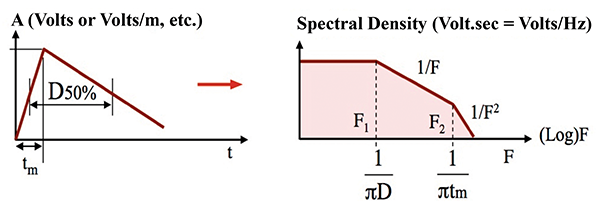 This is shown on Figure 1 where a triangular waveform of current, voltage or field, having a rise time tm and 50% duration “D,” displayed on the left in time domain, is confronted with its frequency representation on the right. The spectrum density has its 1st and 2nd corner frequencies F1 = 1/πD and F2 = 1/π.tm. This F2 frequency corresponds approximately to the equivalent bandwidth discussed previously. In terms of energy, that is (power x duration), related to the area under the spectrum envelope), the largest part is contained in the frequency span up to F1. For instance, with a typical lightning pulse, 60 to 70% of the energy is contained in this area bound by frequency F1.