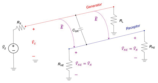 In this model, is the capacitively-induced noise voltage, CGR – is the mutual capacitance between the generator and receptor circuits. It is assumed that both the generator and the receptor circuit are electrically short, and thus the mutual capacitance can be represented as a lumped parameter. In this field model of the capacitive coupling, the electric field lines, , (created by the voltage in the generator circuit, ) originate on the generator circuit and terminate on the receptor circuit.