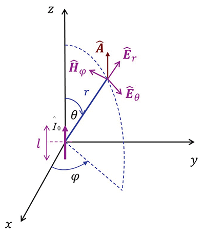 An electric dipole, often referred to as a Hertzian dipole, shown in Figure 1, consists of a short, thin wire of length l carrying a constant current positioned symmetrically at the origin of the coordinate system and oriented along the z-axis.