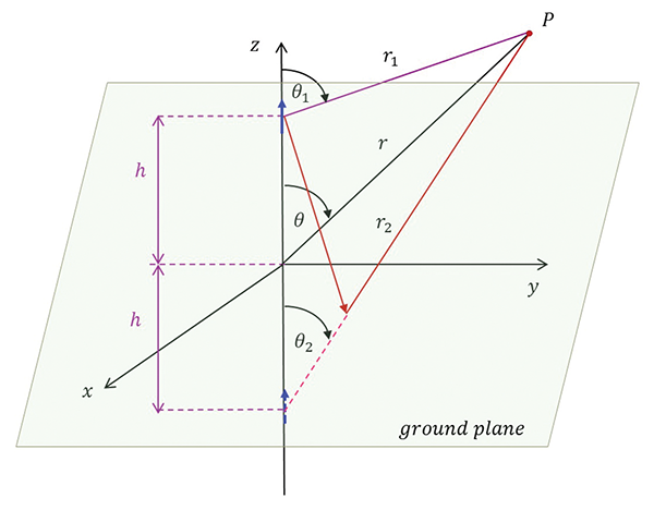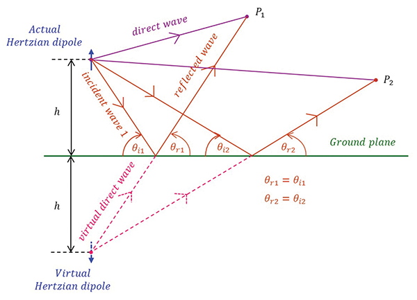 Because of the reflecting ground plane, the total field at an observation point P is the sum of the direct wave and the reflected wave. Obviously, there are no fields below the ground plane.