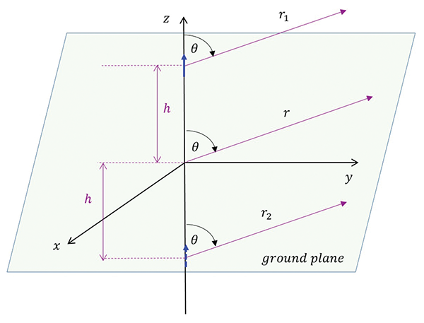 In image theory, a radiating antenna (actual source) is placed at some distance h from a perfect conducting plane. An image of this antenna (virtual source) is placed below the conducting plane at the same distance, h, as shown in Figure 2 [3].