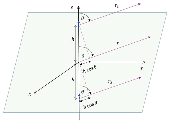 In the far field, r >> h and the lines from the actual and virtual dipoles to the observation point may be considered parallel, as shown in Figure 4.