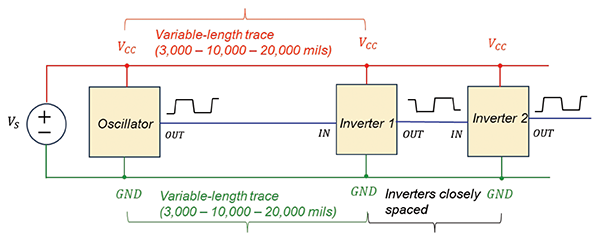 This article describes a laboratory experiment that shows the impact of the decoupling capacitors and a PCB trace length on the signal integrity in a CMOS inverter circuit.