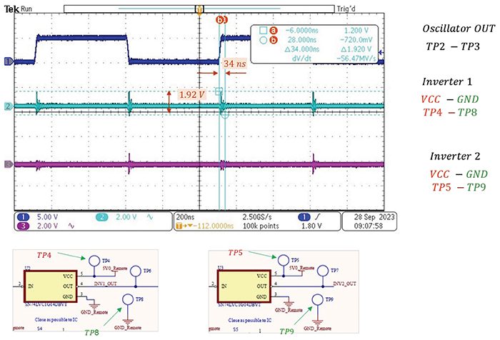 Figures 7 and 8 show the voltages at the VCC pins of the inverters with respect to their GND pins for short traces vs. long traces with a 0.1 µF decoupling capacitor at each inverter.