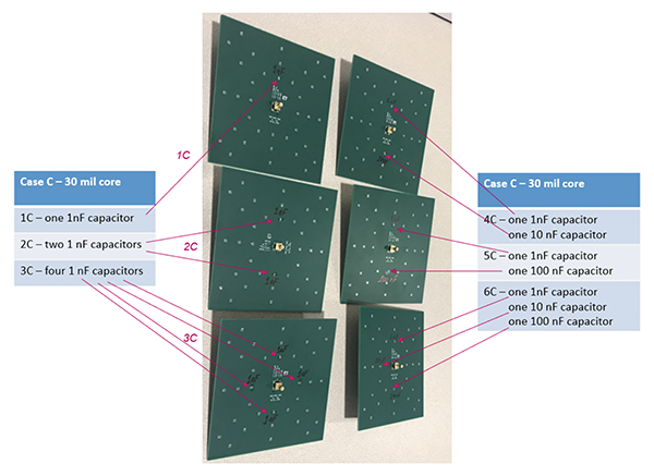 In Part II we use the 30-mil boards and populate them with multiple capacitors of the same value (Cases 1C, 2C, 3C) as well as with the capacitors of different values, decades apart (Cases 4C, 5C, 6C). The location of the capacitors for all cases in this study is 1 inch away from the measurement point, as shown in Figure 2.