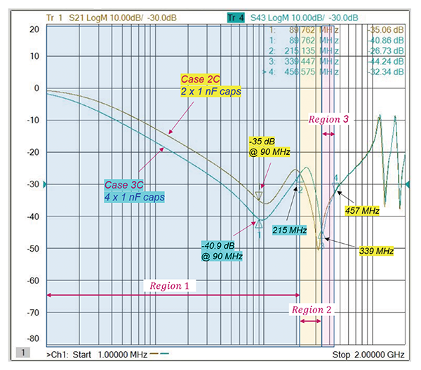 Region 2 (where the Case 2C PCB outperforms the Case 3C PCB) is shifted to the right and extends from 215 MHz to 339 MHz. Region 3 is also affected and extends now from 339 MHz to 457 MHz. Beyond the frequency of 457 MHz the capacitors have no impact on the impedance.