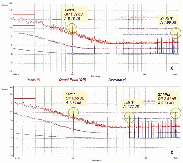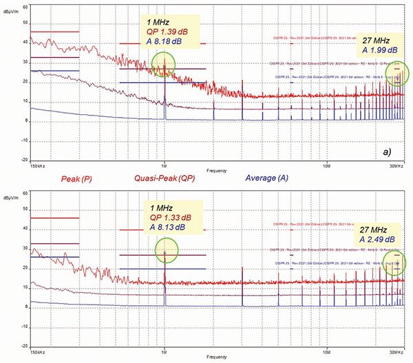 The measurements were performed in a semi-anechoic chamber, in accordance with CISPR 25 Edition 5 automotive standard. A monopole antenna was used in the frequency range of 150 kHz – 30 MHz with a bandwidth of 9 kHz and vertical polarization. A biconical antenna was used in the range of 30 MHz – 300 MHz with a bandwidth of 120 kHz and both horizontal and vertical polarization. A log-periodic antenna was used in the range of 300 MHz – 1GHz with a bandwidth of 120 kHz and both horizontal and vertical polarization. All measurements were taken with the average, peak, and quasi-peak detectors.