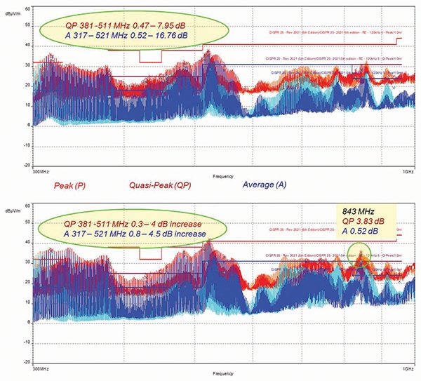 Quasi-peak detector: Capacitors increased the failures in the frequency range 380 – 511 MHz by 2 – 10.6 dB. They introduced a new failure at 844 MHz.