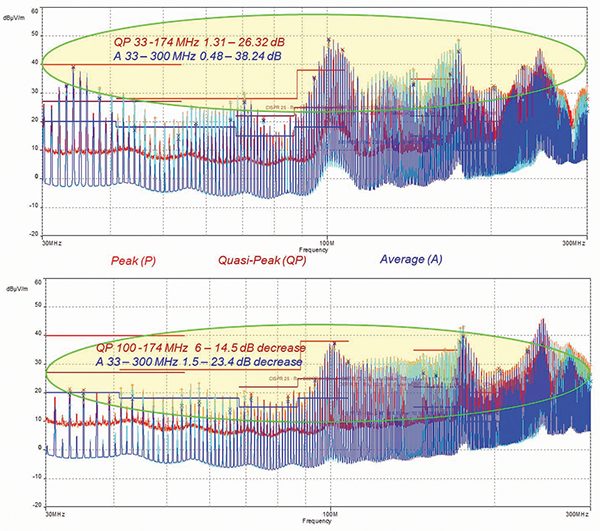 Average detector: Capacitors eliminated failures in the frequency range 42 – 100 MHz. In the frequency range 150 – 300 MHz, multiple failures were eliminated, and the remaining ones decreased by 2 – 10 dB.