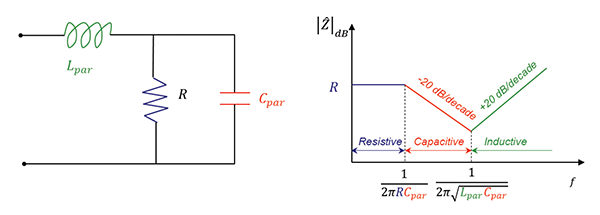 Circuit model and the impedance vs. frequency curve (straight-line approximation) for a resistor and its parasitics (with no traces attached) are shown in Figure 1 [1].