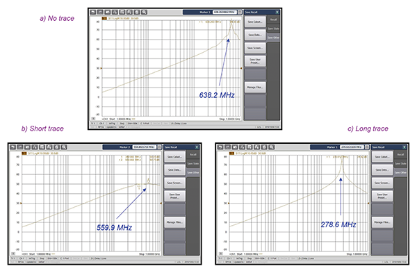 Note that the results in Figure 10 are consistent with the simulation results in Figure 7. The short trace resonates at 1 GHZ while the long one resonates at a frequency of 559.8 MHz. This behavior is the direct consequence of the increase in the trace inductance.