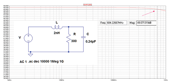 The low-frequency impedance stays at 49.5 dB and drops by 1 dB at 1 GHz. The self resonant frequency is well above 1 GHz and thus not shown in the simulation. This simulation result will be confirmed in the measurement section.