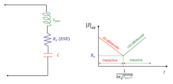 Circuit model and the impedance vs. frequency curve for a capacitor with its parasitics (with no traces attached) are shown in Figure 5 [2].