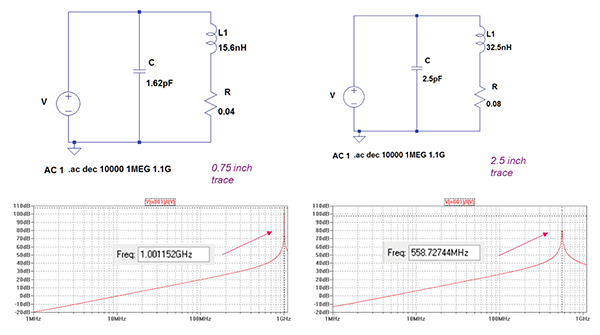Figure 7 shows the circuit models and the impedance curves for two PCB traces of length 0.75 and 2.5 inches, respectively.