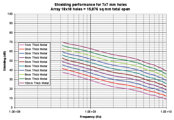 Figure 6 shows a summary of the thickness of the metal vs. shielding performance at 1 GHz. For example, if 40 dB of shielding is desired at 1 GHz, but a hole size of 4×4 mm is too small for the required air flow, then the hole size can be increased to 7×7 mm if the metal thickness is increased from 1 mm to 4 mm.