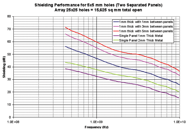 Since the air vent holes are usually stamped out during manufacturing, thicker metal may not be able to be stamped as easily. If multiple 1 mm stamped metal air vents are stacked, the thicker metal can be obtained. Since it is likely that some of the stacked metal panels may not make a good electrical contact, a small space was inserted between stacked panels. To observe the results, Figure 7 shows the case for 5×5 mm holes and two 1 mm thick panels now with space between them, or between 1-5 mm of space. The additional spacing actually increases the amount of shielding observed. Small spacing has no impact on the air flow and helps the shielding.