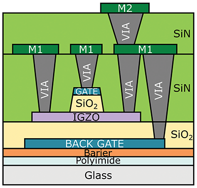 With such characteristics, the IGZO TFTs can be used to fabricate relatively complex circuits on flexible substrates. Consequently, IGZO TFTs are evolving beyond displays and entering the fields of wearable devices and the Internet of Things (IoT). Some highlights include an ultra-flexible circuit for recording electrocardiograms [2], radiofrequency identification (RFID) tags and near-field communication (NFC) tags [1]. Even the memory field has noticed IGZO and its extremely low OFF current and recently demonstrated a capacitor-less IGZO-based DRAM cell with a retention time longer than 400 seconds [3]. We can expect the first IGZO products beyond display applications to emerge in the near future.
