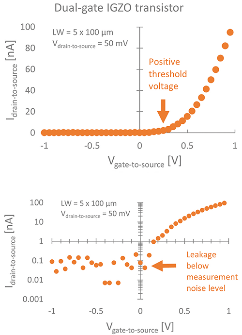 A-Si TFTs are mainly implemented as simple pixel switches due to their low charge carrier mobility (0.5-1 cm²/Vs). An alternative semiconductor on glass substrates is low-temperature polycrystalline silicon (LTPS), outperforming a-Si TFTs by a 100x larger mobility (50-100 cm²/Vs) and often used for high-end displays and imagers. Despite the advantages, fabrication of an LTPS TFT takes more process steps, is limited in substrate size, and requires a larger process temperature. Oxide-based semiconductors as indium-gallium-zinc-oxide (IGZO) fill this gap between a-Si and LTPS nicely, exhibiting low processing temperatures and a decent charge carrier mobility of 10 up to 40 cm²/Vs [1].