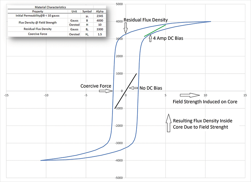 The black diagonal line represents the area in which the core will operate if no DC bias is induced on the core. Notice that the line is more vertical than the green line above and a bit to the right. The green line is the area where the core operates if a DC current is induced on the core. Notice that the green line is less vertical than the black line. For the same change in the field strength inside the core, the change in flux is 2000 Gauss for the black line and only 500 Gauss for the green line. If the DC bias is increased, the induced flux continues to decrease.