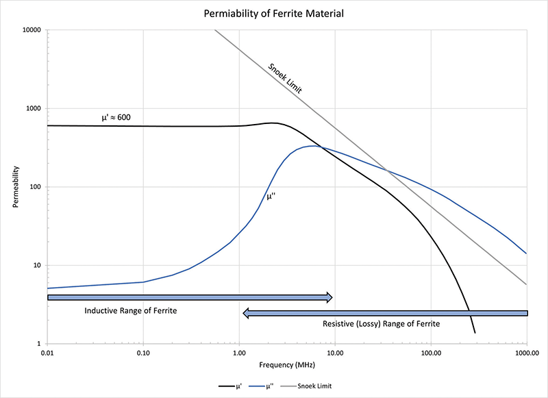 Notice the line called the Snoek Limit, also known as Snoek’s Law. Dr. Jacob L. Snoek found these characteristics in ferrites in his research published in 1947. The general limit for ferrites is simplified as a line with the formula 5600/(frequency in MHz). Plots depicting the real permeabilities of ferrites with this limit show that the µ’ line may approach this limit but does not cross it. The loss factors tend to cross the limit but with little margin. With this in mind, ferrites that have high permeability at high frequency do not exist at this time. Materials that exceed the Snoek Limit are being created but are not commercially available to our knowledge.